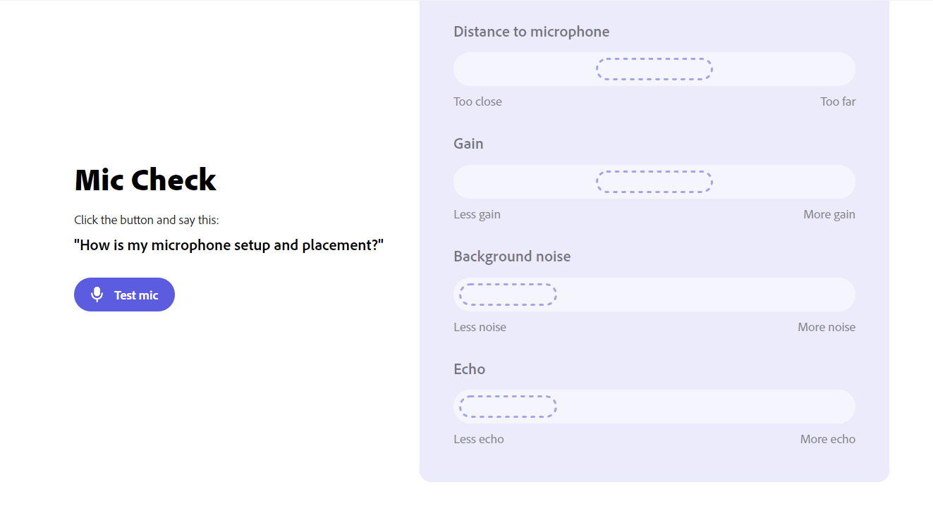 Adobe Mic Check — це безкоштовний онлайн-сервіс від Adobe, створений спеціально для стрімерів та контент-криейторів. Сервіс допомагає швидко виявити проблеми з мікрофоном та отримати професійні рекомендації для покращення якості звуку без необхідності встановлення додаткового програмного забезпечення.